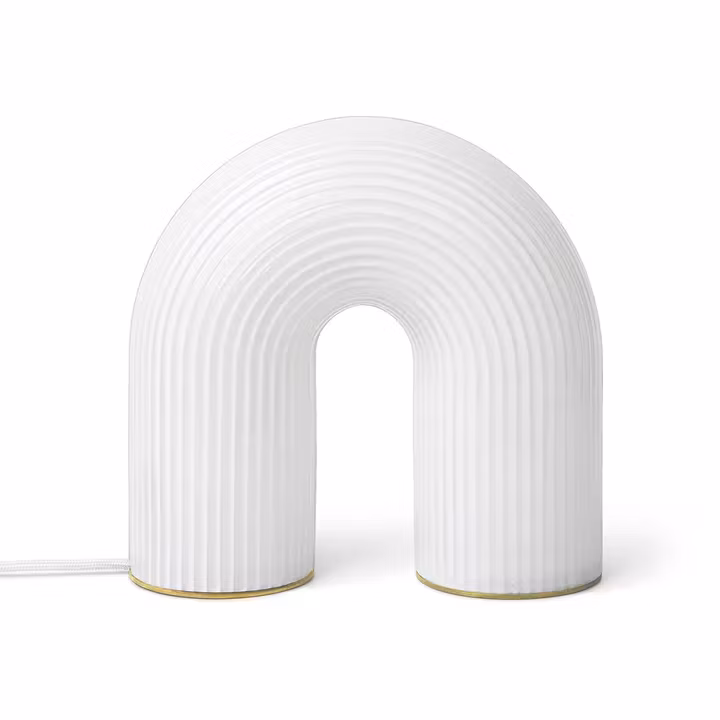 Vuelta bordslampa från danska Ferm Living har formen av en skulptural båge som för tankarna till arkitektur från antikens Grekland och romerska riket. Lampan är tillverkad av glas och de båda benen står på var sin tunn bas av mässing. Vuelta har en integrerad LED-ljuskälla som avger ett mjukt och diffust ljus. Den coola bordslampan har även en justerbar dimmer så att du ska kunna använda den både som en dekorativ lampa på byrån och som en läslampa på sidobordet vid favoritfåtöljen.