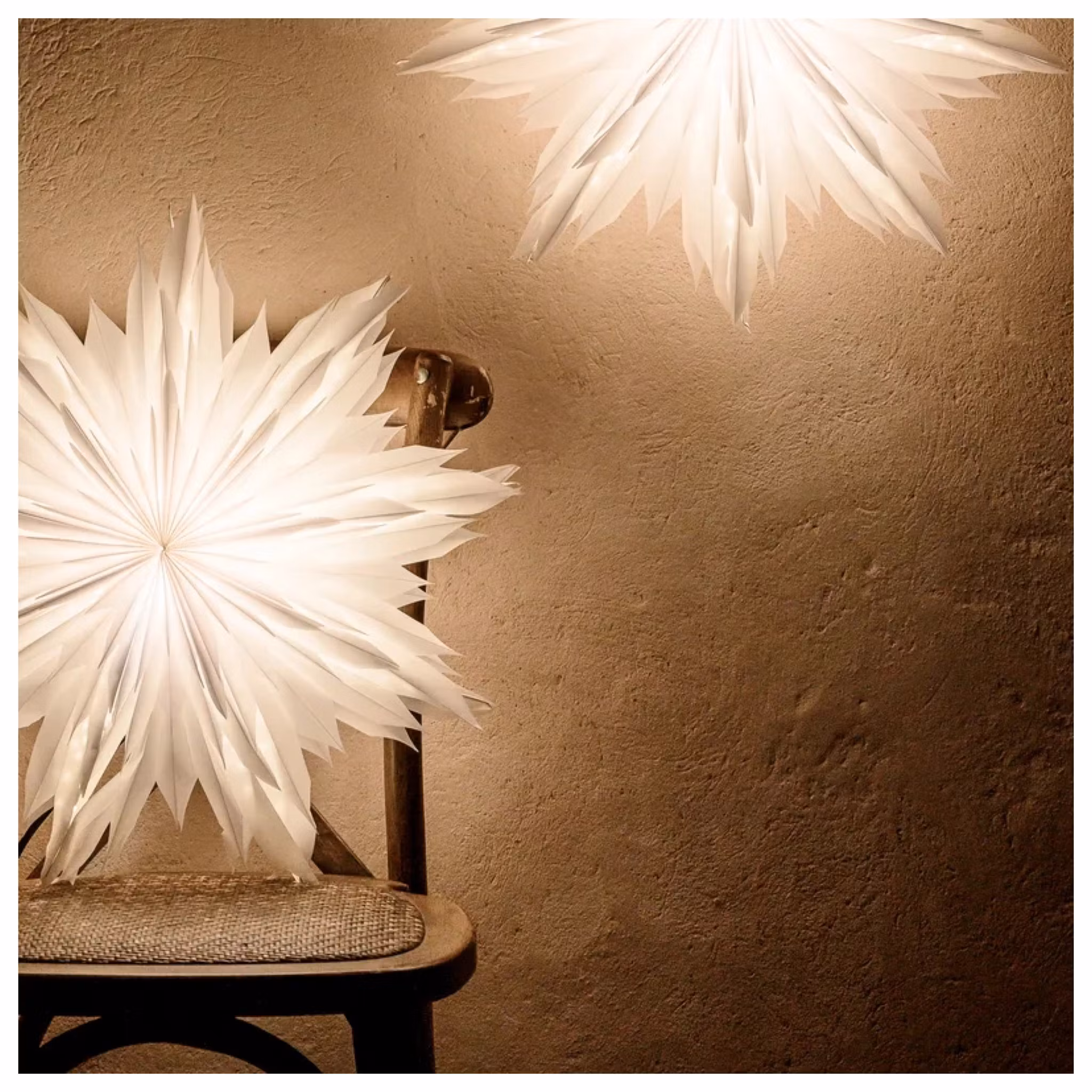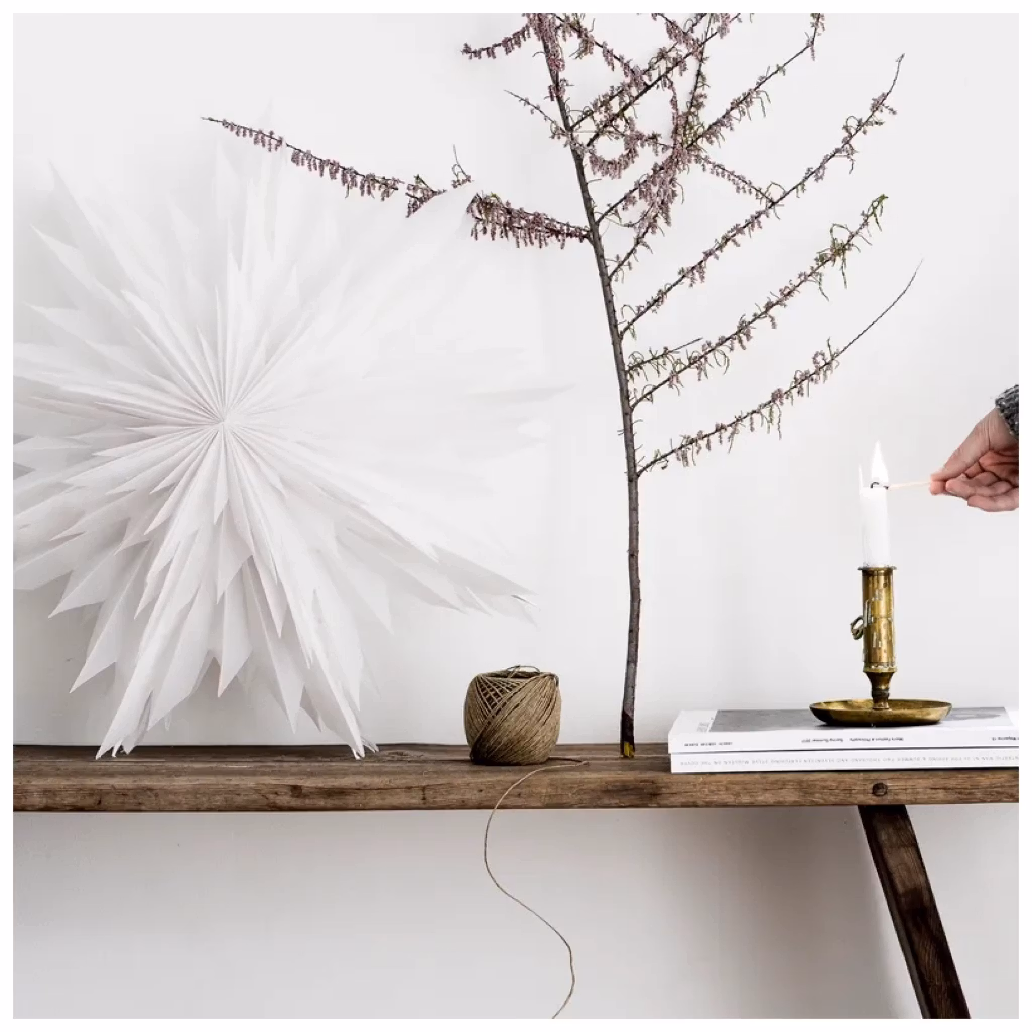 Oslo julstjärna Ø60 cm från Watt & Veke är en sprakande pappersstjärna som likt Norges sagolika fjordar och magiska fjäll skapar ett dramatiskt ljusspel. Adventsstjärnan är omsorgsfullt vikt för hand i halvtransparent papper av högsta kvalité och skapar ett mjukt och elegant uttryck i fönstret.