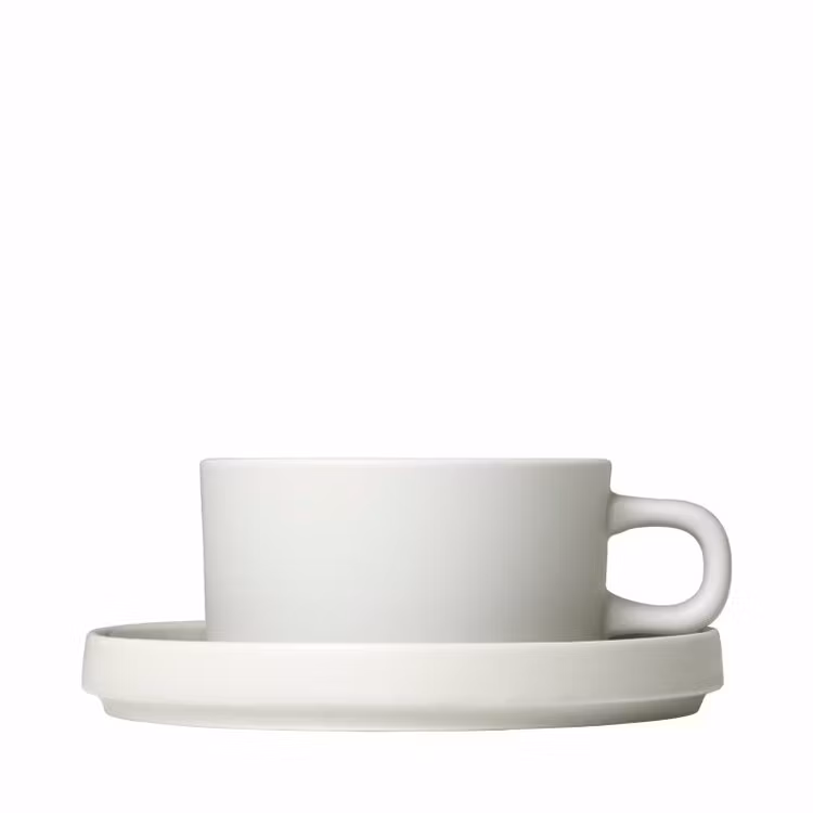 Set med två stycken tekoppar och fat, i glaserad keramik i färgen Moonbeam. Blomus nya kollektion PILAR bjuder in till den perfekta måltiden, med sina trendiga färger och solida, tidlösa material. Bakom kollektionen PILAR står designern Nina Thöming från Flöz Design.