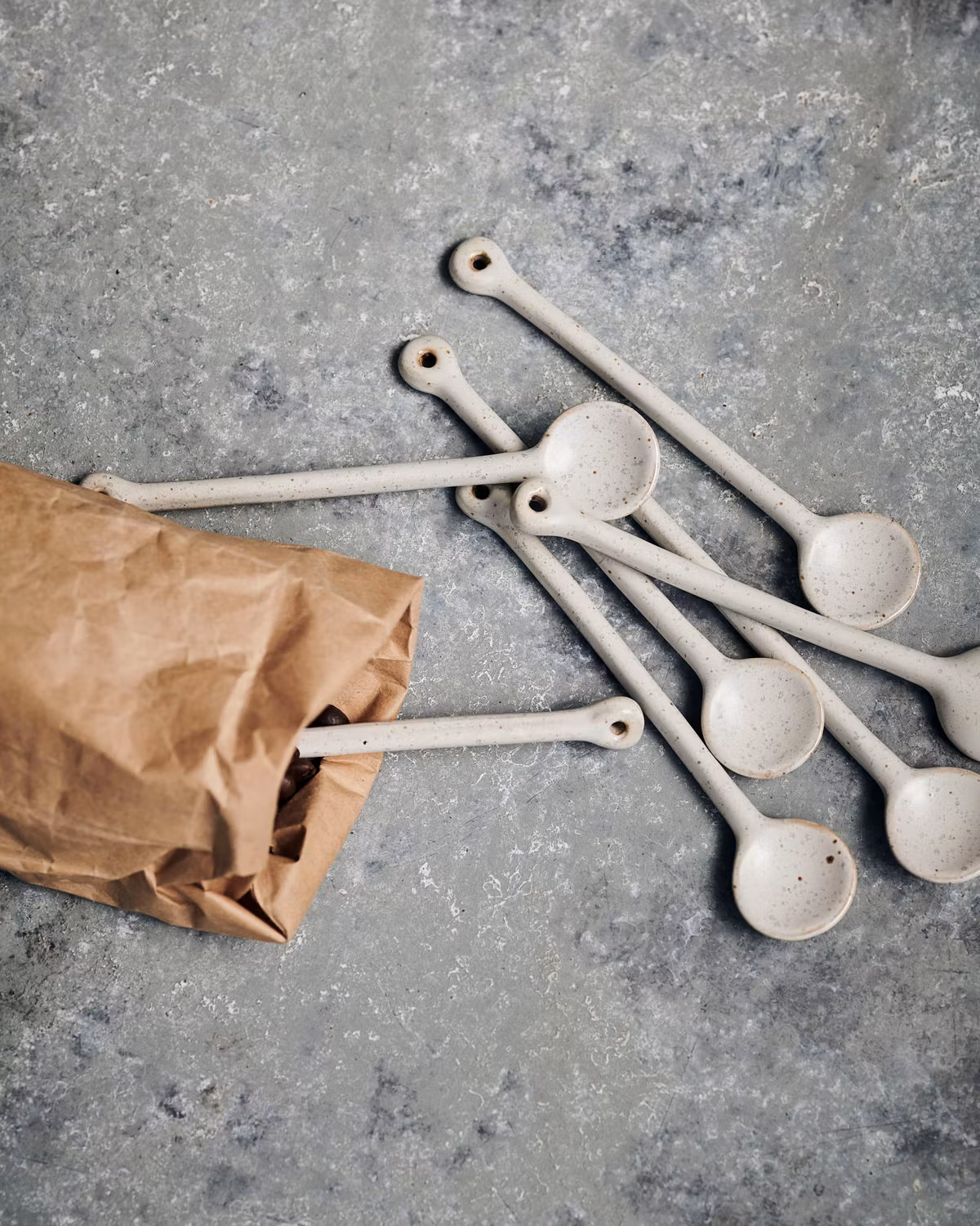 Skeden Pion från House Doctor har designats som del av setet med muggar och koppar i samma design. Skeden har en slät, gråvit lasyr med små ”fläckar” som skapar en design med en självklar plats i vardagen. Använd skeden för att röra i koppen och låta kaffet eller teet svalna, eller se till att du får smaka på all god grädde när du druckit varm choklad. Du kan kombinera skeden Pion med keramiska koppar och muggar i liknande toner för att sätta pricken över i:et.