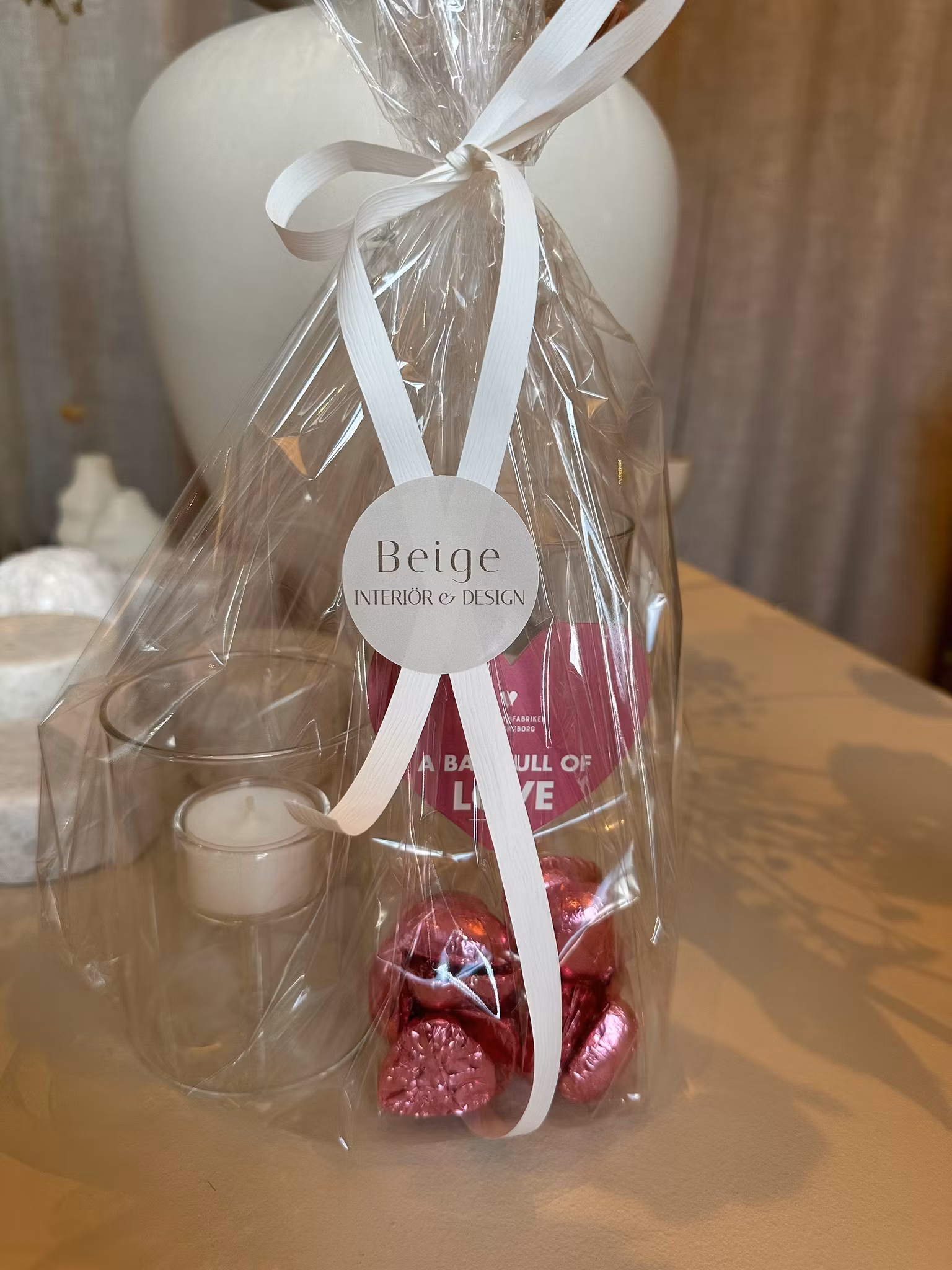 Två ljuslyktor i klarglas med fina värmeljus till så att man får den ”svävande” känslan. Pricken över i-et med chokladhjärtan från konfektyrfabriken i Helsingborg.