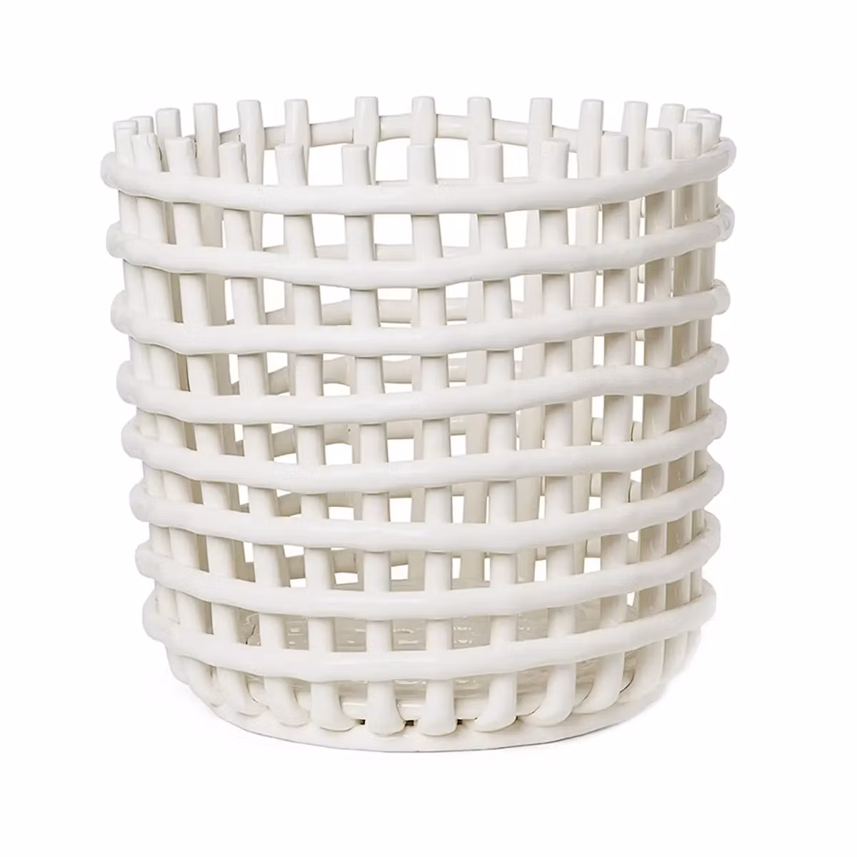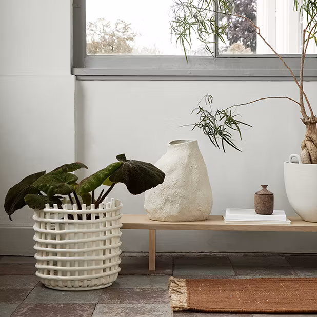 Ceramic Basket XL är en multifunktionell korg från danska Ferm Living som är skapad med liknande vävteknik som klassiska korgar men är istället tillverkad i glaserad keramik. Ceramic Basket kan användas till allt från förvaring av plädar till större blomkrukor med växter. Korgen är tillverkad för hand vilket gör att varje produkt är unik.