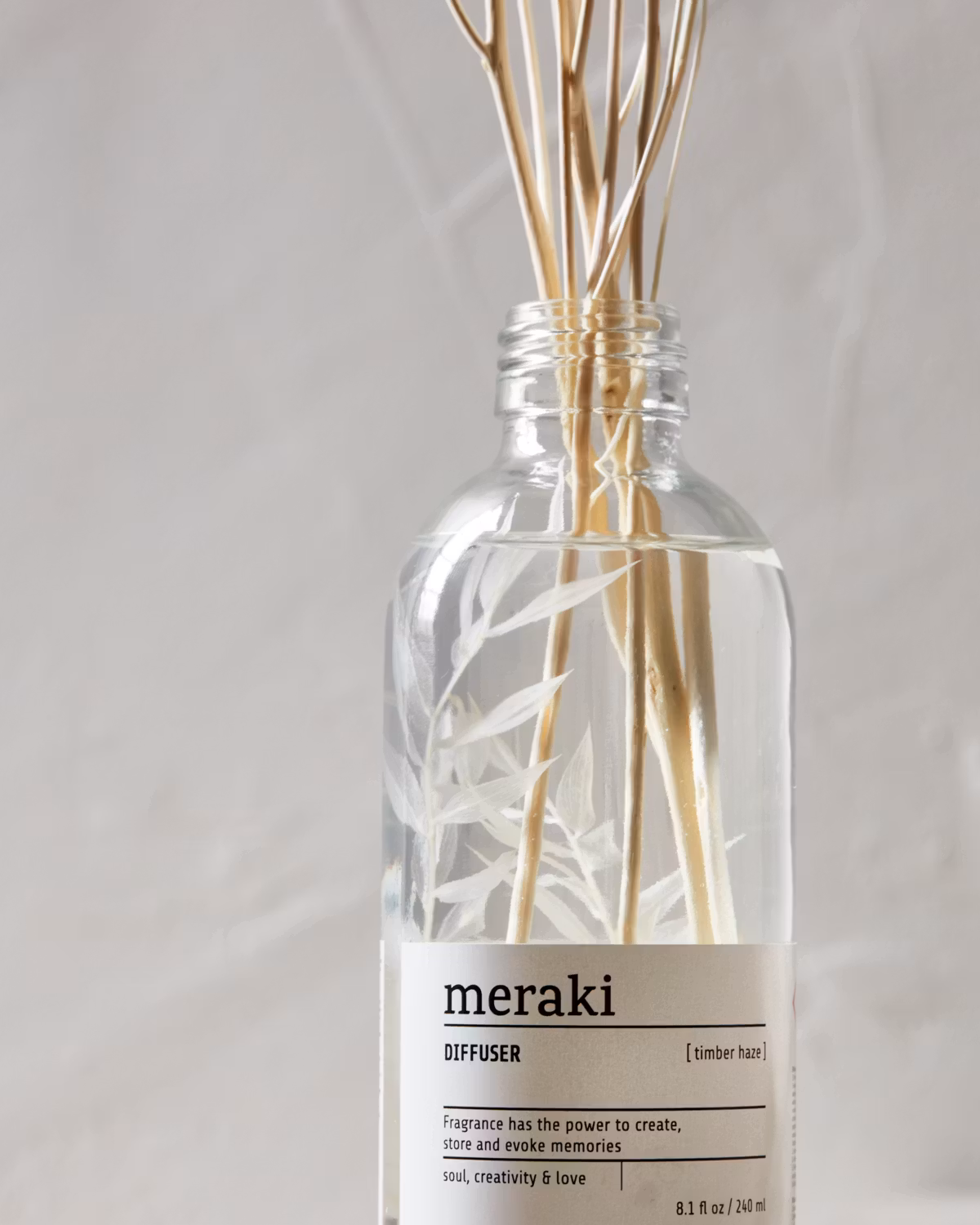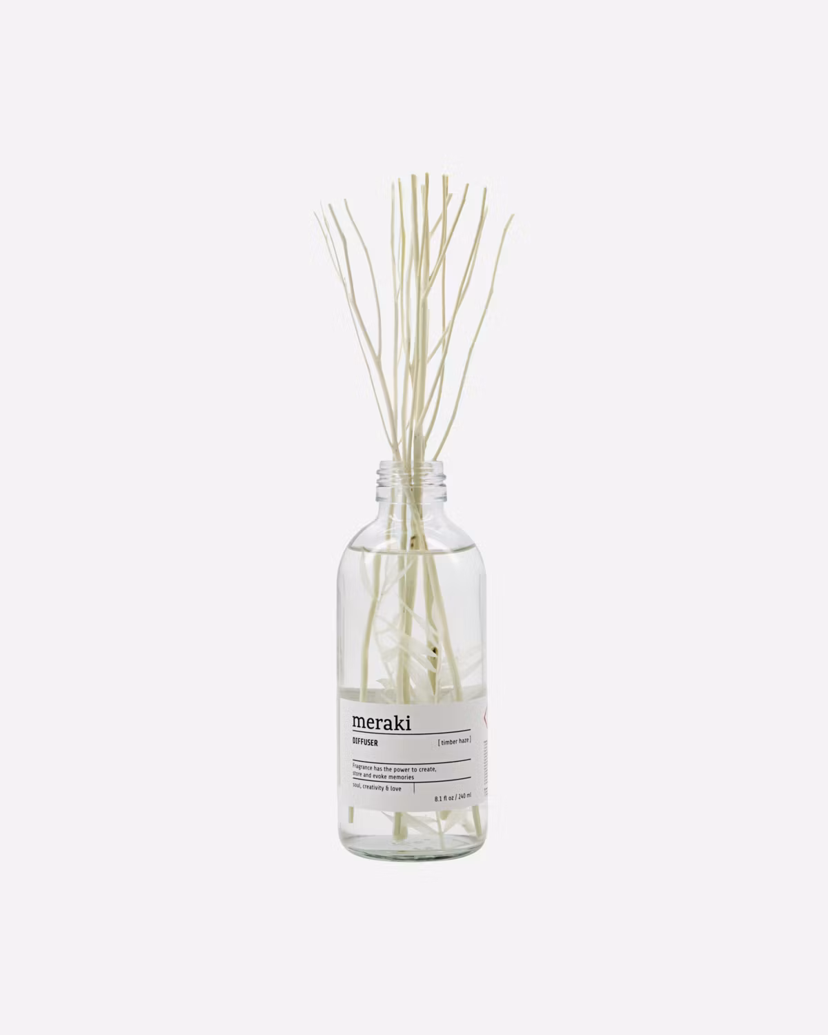 Ge ditt hem en ljus, fruktig och blommig doft med Timber Haze, en diffusor gjord av Meraki. Med noter från grön citrus och blommor som ros, pelargon och jasmin hjälper det till att skapa en upplyftande och levande atmosfär. Som att kliva in i en trädgård i som står i full blom. Pinnarna i rotting absorberar vätskan och avger doften i hela rummet. Designen består av en genomskinlig flaska och en dekorativ kvist inuti och ger en lätt, feminin touch till ditt badrum, hall eller vardagsrum. Diffusorn håller i cirka 4 till 6 månader, beroende på hur många pinnar du använder åt gången.