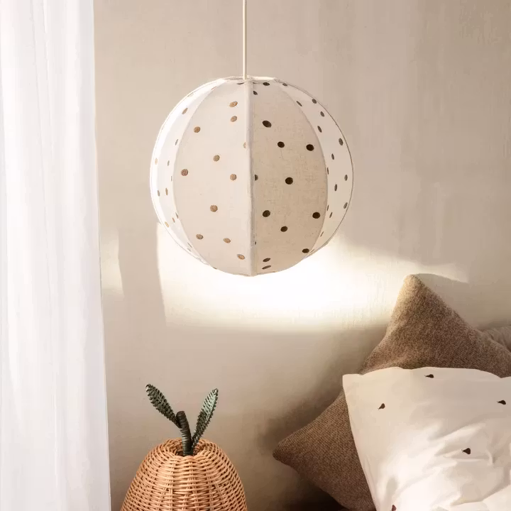 Dots lampskärm Ø35 cm från danska Ferm Living är en modern tolkning av den traditionella rislampan med broderade prickar i olika storlekar på bomullsskärmen. Lampskärmen har ett lekfullt uttryck och kommer att gillas av båda stora som små. Kombinera Dots lampskärm med valfri upphängning och placera den i sovrummet eller vardagsrummet för en mysig belysning.