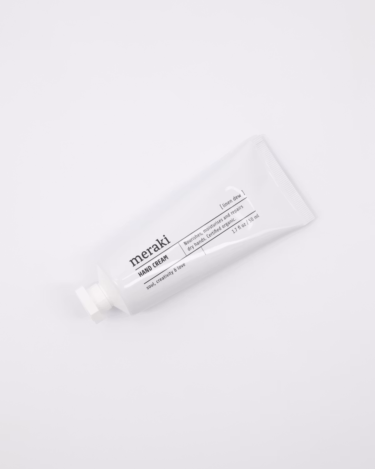En handkräm som ger näring, återfuktar och gör händerna mjukare utan att vara flottig. Linen Dew från Meraki innehåller rikliga mängder ekologiska ingredienser som aloe vera, kakaosmör och avokadoolja, vilket även bidrar med antioxidanten E-vitamin. Certifierat ekologisk av ECOCERT Cosmos. Doft: pepparmint och patchouli