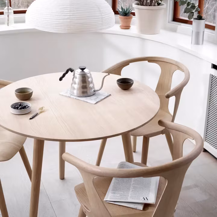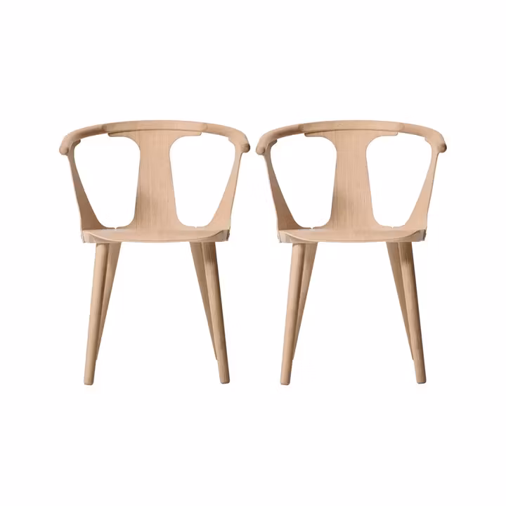 Stolen In Between från &Tradition är designad av Sami Kallio, en finsk-svensk formgivare specialiserad på trä och traditionell träbearbetning. För att tillverka In Between används två klassiska tekniker: Formpressning för att ta fram sitsen och ryggstödet samt svarvning för att ta fram de runda benen och armstödet. Det är en snygg och bekväm stol som passar lika bra vid matbordet som på kontoret. Namnet In Between syftar på det som utmärker stolen allra mest, nämligen luckorna mellan ryggstödet och sidopanelerna.