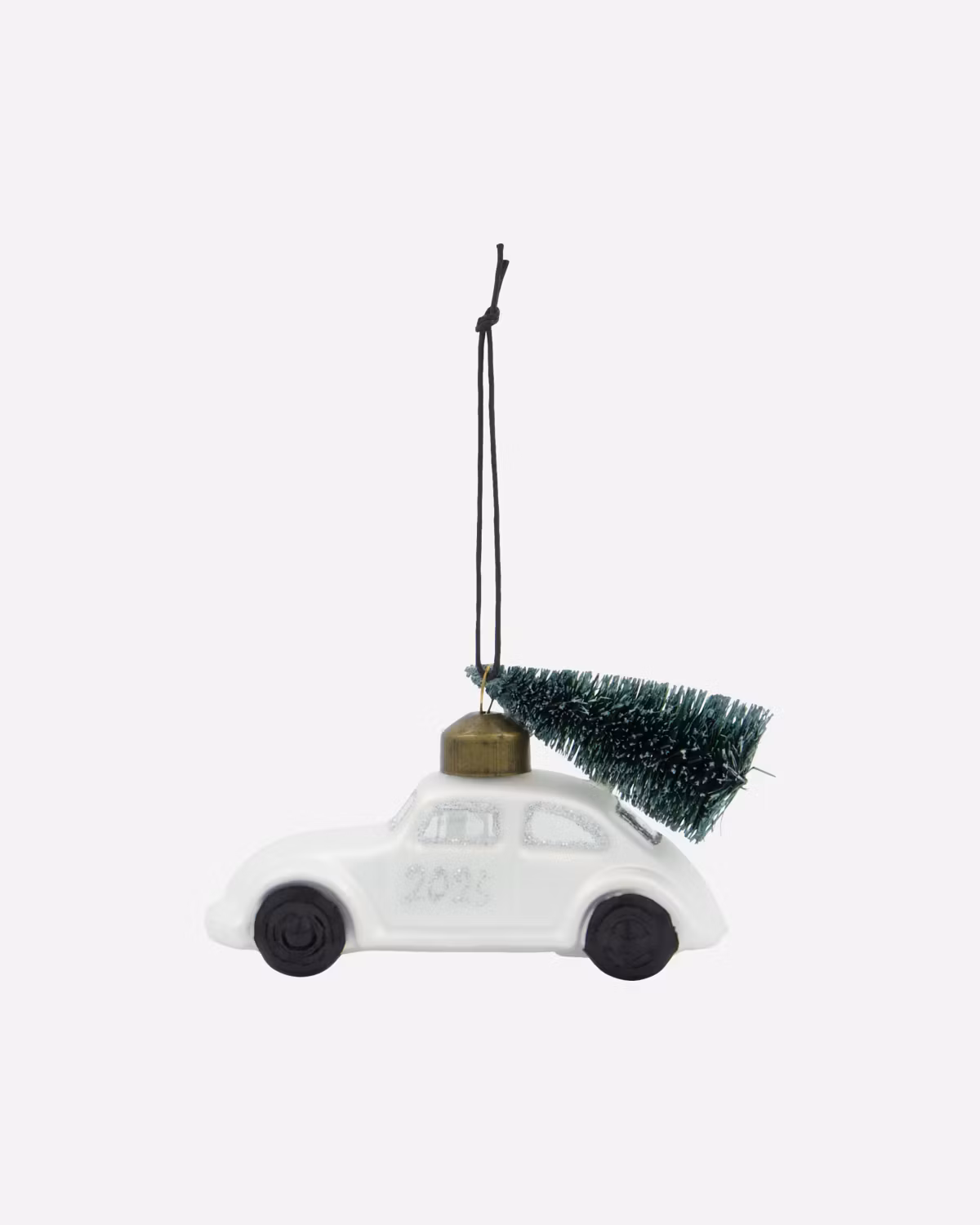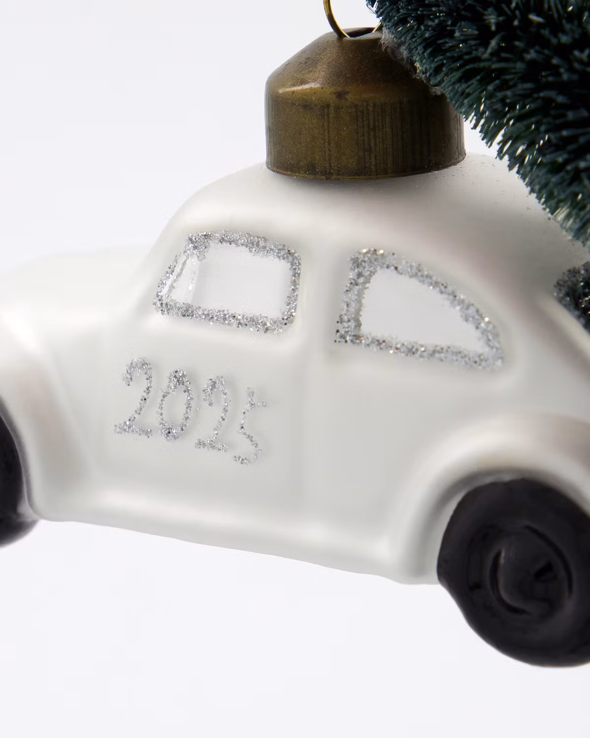 Förgyll din jul med denna charmiga juldekoration i glas, en vit bil med årtalet 2025 i silverglitter. Med ett julgran på taket fångar den essensen av att transportera hem julgranen, en älskad tradition.