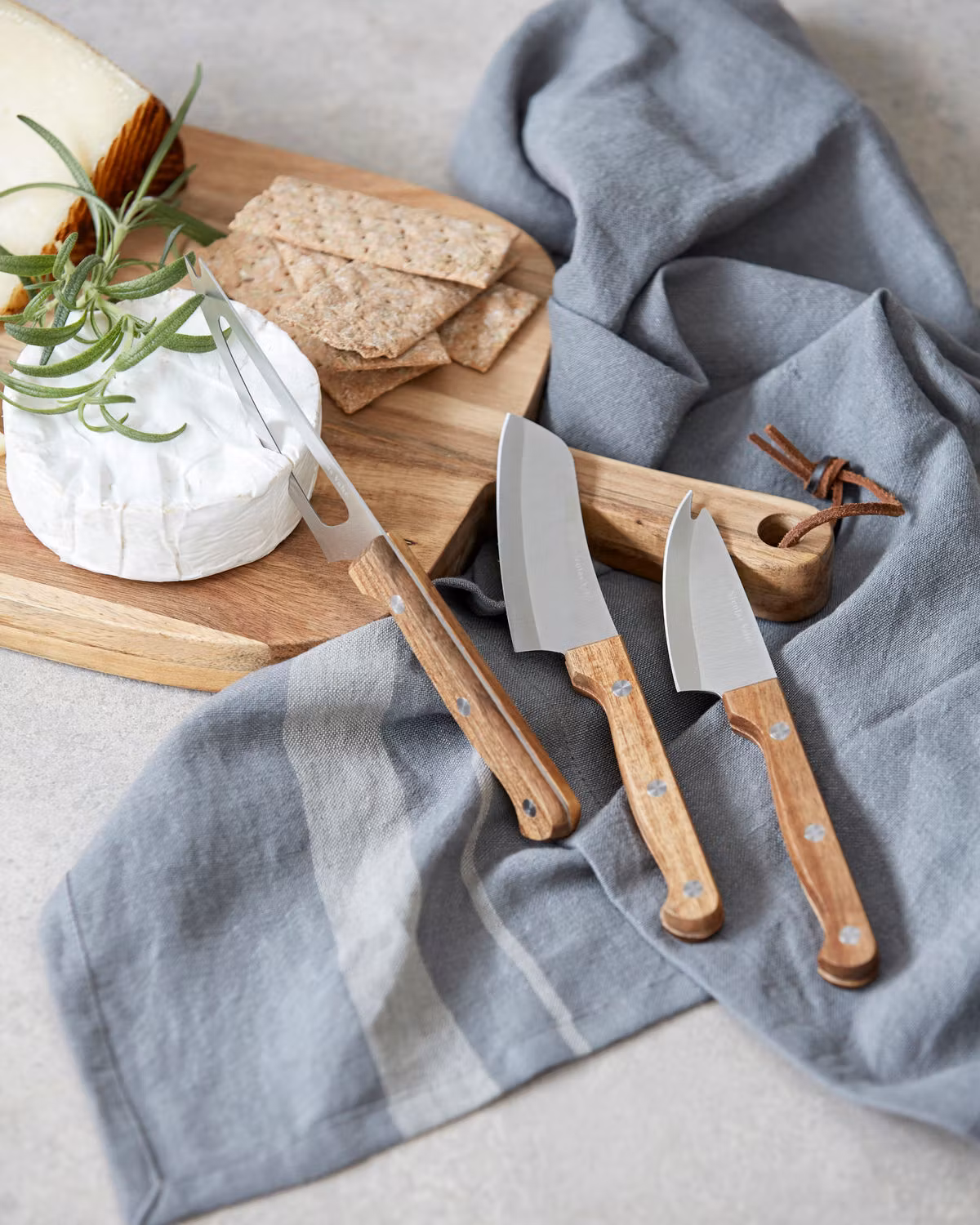 De tre snygga ostknivarna från Nicolas Vahé kommer att smycka varje fint dukade ostbricka. Knivarna är framställda av rostfritt stål med ett satinerad finish för en stilren look, och tjusigt akaciaträd på skaften för ett läckert, simpelt uttryck. De tre knivarna är perfekta till att skära dina älsklingsostar, eftersom de passar till alla former av mjuka och fasta ostar, som exempelvis mögel- och hård ost. Vi rekommenderar att diska knivarna per hand efter användningen.