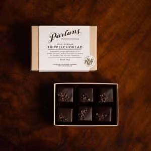 TRIPPELCHOKLAD - choklad, choklad och choklad för dig som inte får nog av choklad. Varsågod, detta är din nya favoritask. Mjuk chokladkola täckt med ett tunt lager choklad och strösslad med små bitar av krossad kakaoböna.
