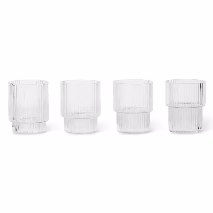 Ripple espressoglas 6 cl 4-pack från danska Ferm Living är små glas med många användningsområden. Använd dem som glöggmuggar, espressokoppar, till likör och snaps eller varför inte som äggkoppar? Espressoglasen i munblåst klarglas har en räfflad struktur vilket kännetecknar Ripple-serien.