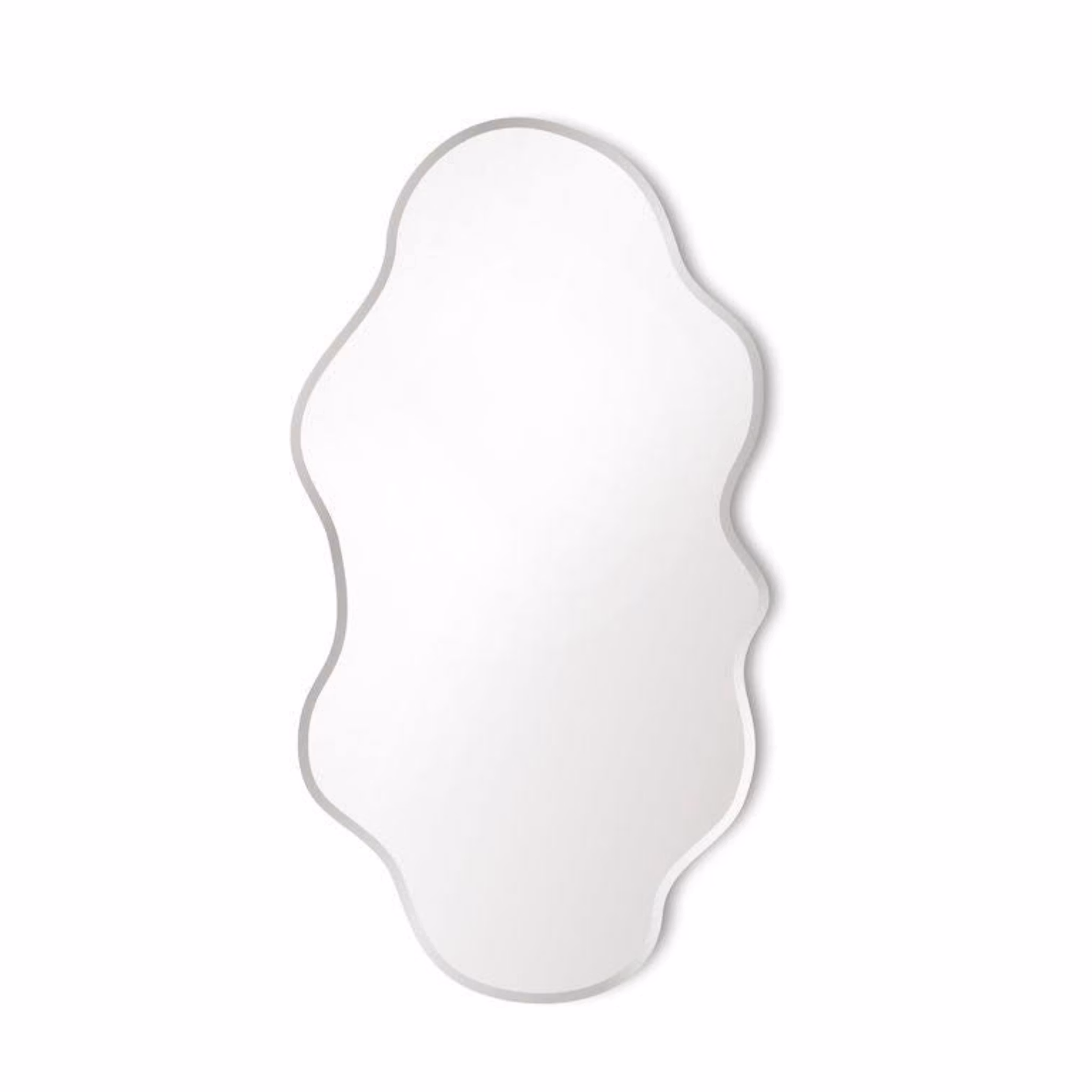 En fantasifull spegel med organiska former som leker med beskådaren på ett förförande sätt. Lika fin liggande som stående, ensam som i par. Spegelglas med fasade kanter. Finns i två storlekar.