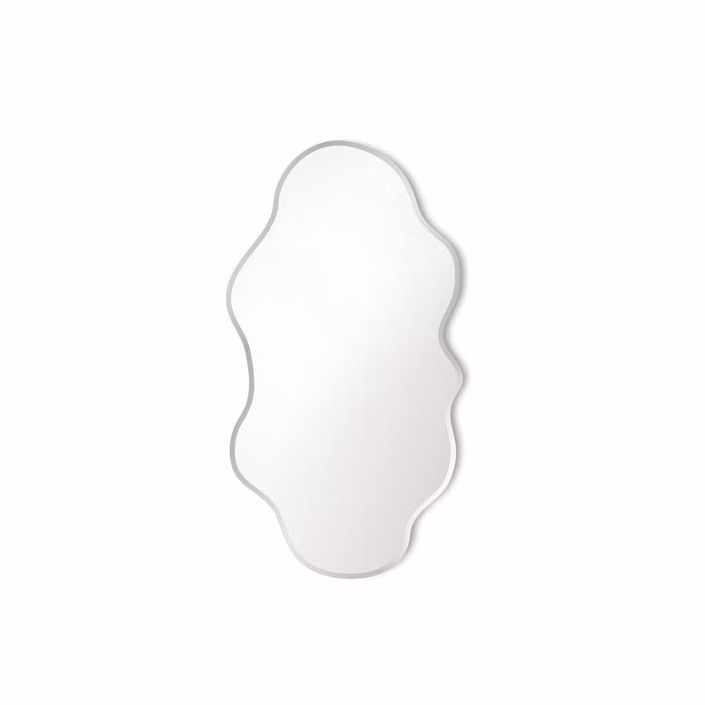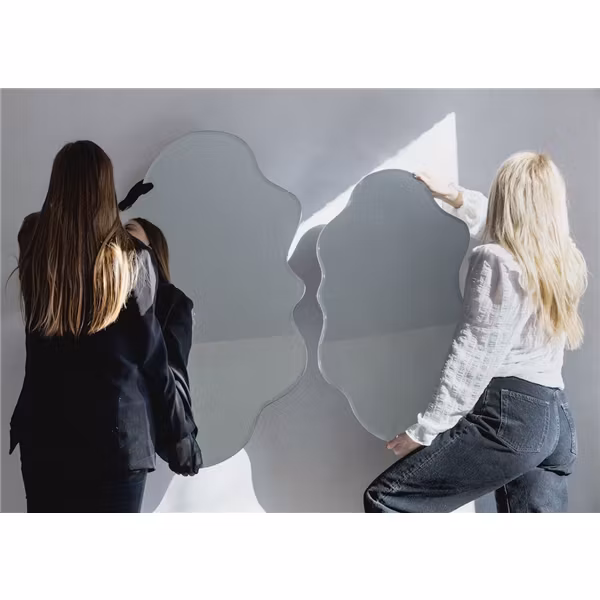 En fantasifull spegel med organiska former som leker med beskådaren på ett förförande sätt. Lika fin liggande som stående, ensam som i par. Spegelglas med fasade kanter. Finns i två storlekar.