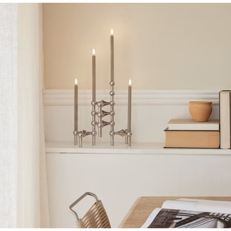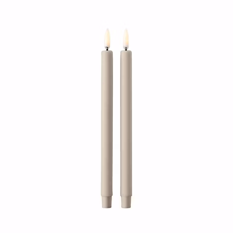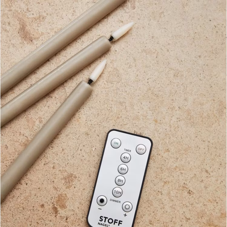 STOFF LED-ljus by Uyuni Lighting har allt det fina som vanliga ljus har och med en säkrare användning. Ljusens lätt flammande låga i kombination med den paraffinbehandlade ytan gör LED-ljusen verkliga och ger samma mjuka och inbjudande känsla i rummet som vanliga ljus. För att släcka ljusen kan du antingen skruva loss botten för att lossa batterierna eller använda den inbyggda 6-timmars-timern.
