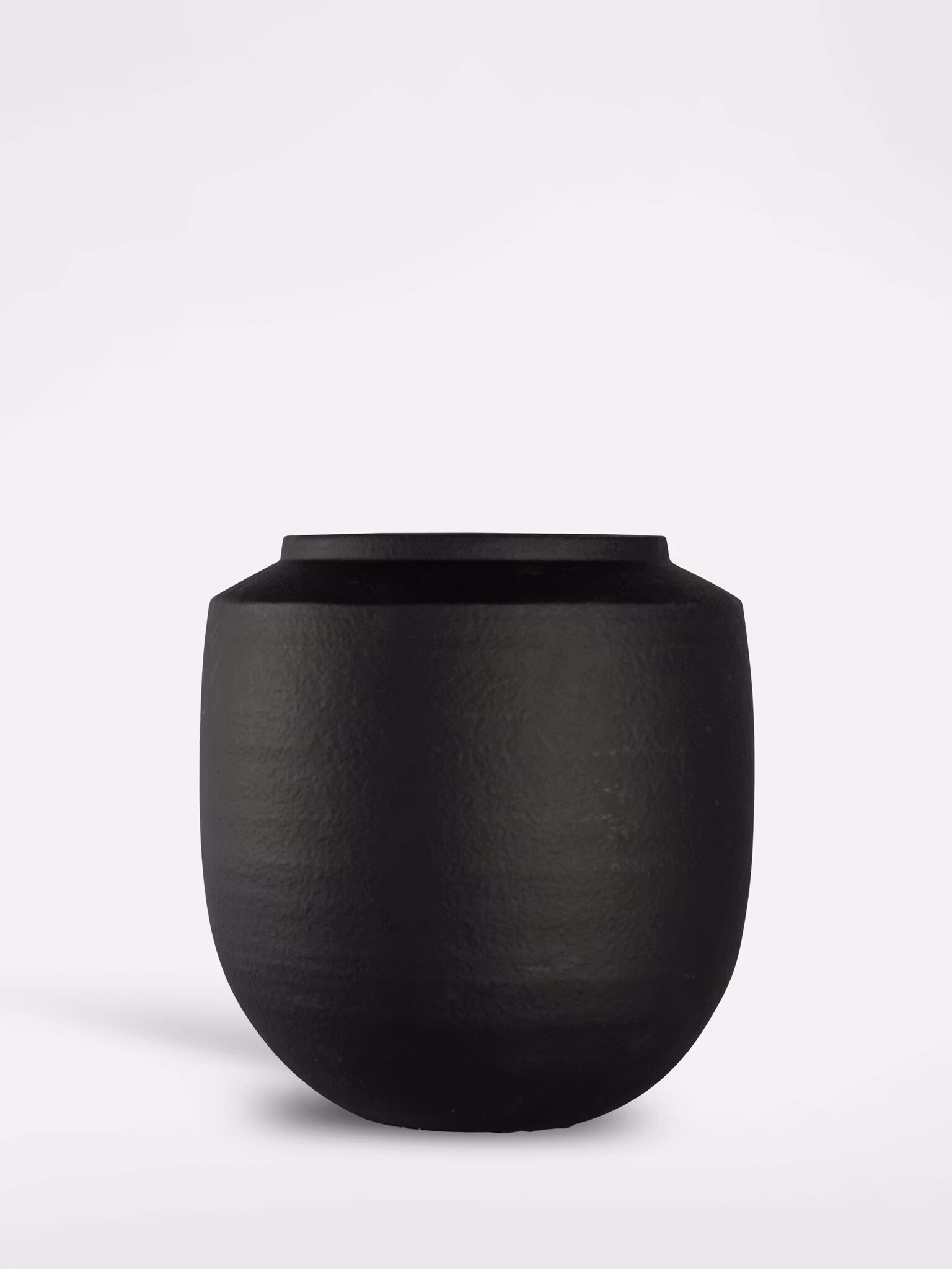 Stor urna I mattsvart. Formen är rund och mjuk, och den mattsvarta färgen blir en härlig kontrast till all färg som blommor och växter bär med sig.