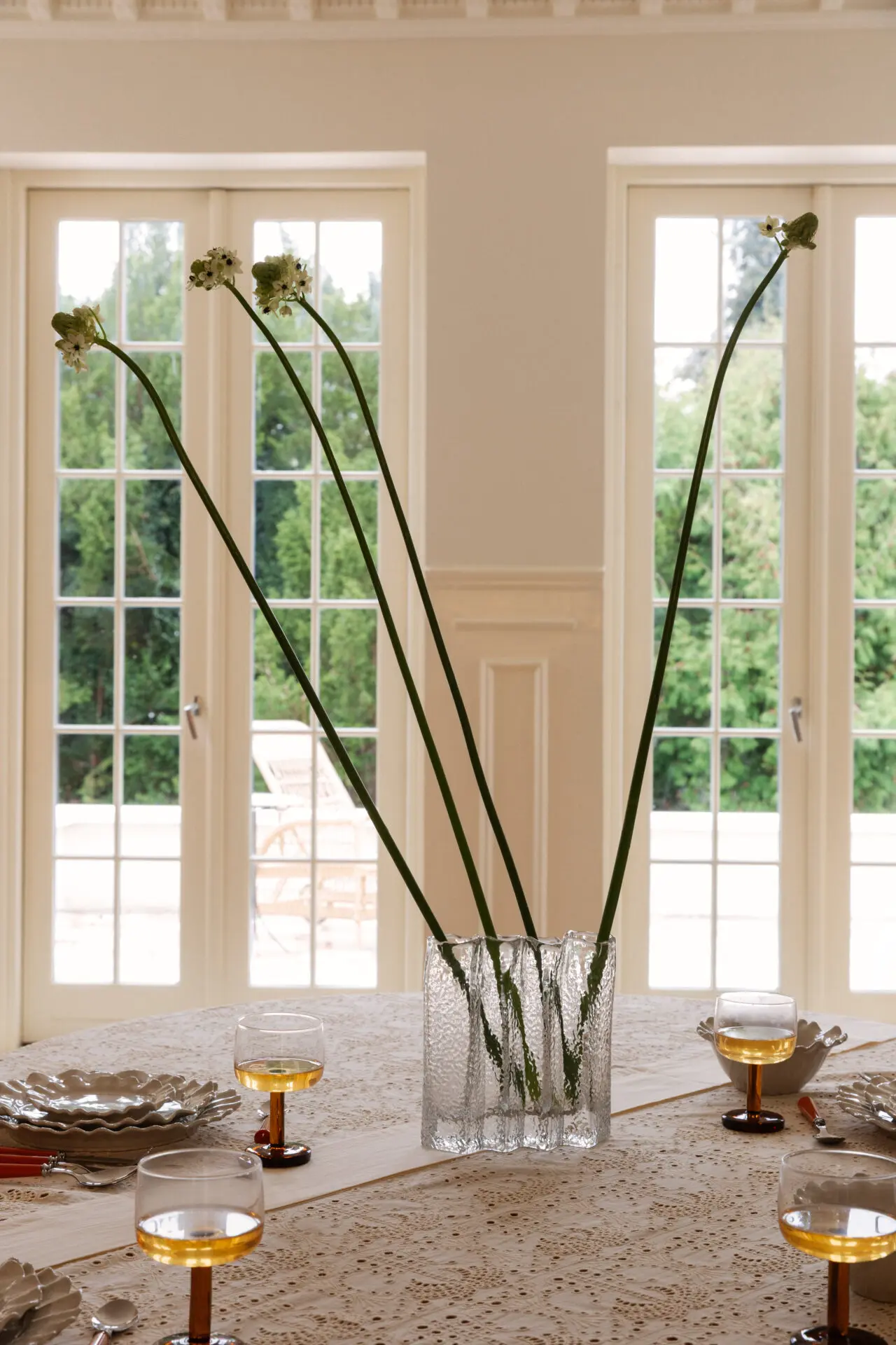 Elegant och lyxig vas i klarglas, med en design som låter varje blomma stå vackert och framhäva sin fulla prakt.