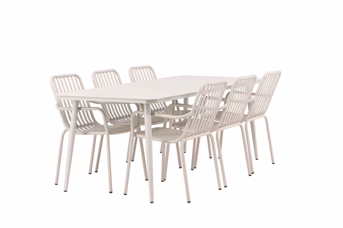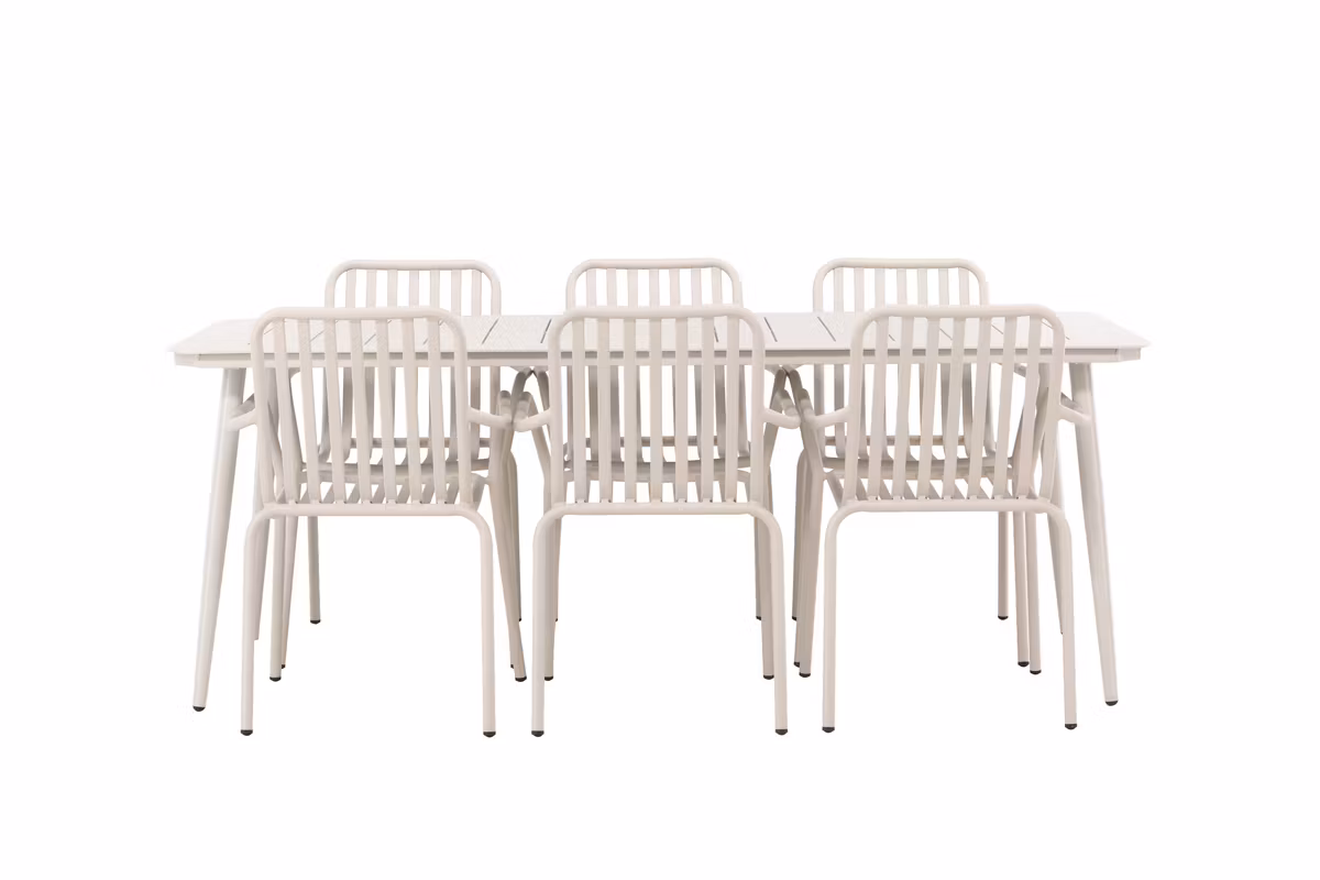 En matgrupp som är lika modern som tidlös i smickrande beige kulör! Matbordet Lina har en rektangulär toppskiva och lätt utsvängda ben, genomgående tillverkat i beige stål. Här i perfekt kombination med snygga matstolar från serien Peking. Stolens ribbade utförande och den mjuka färgen i beige ger dig ett charmigt blickfång. Möblera uteplatsen i trendsäkra kulörer och smickrande Skandinavisk design! Bordets mått: 200x90cm.