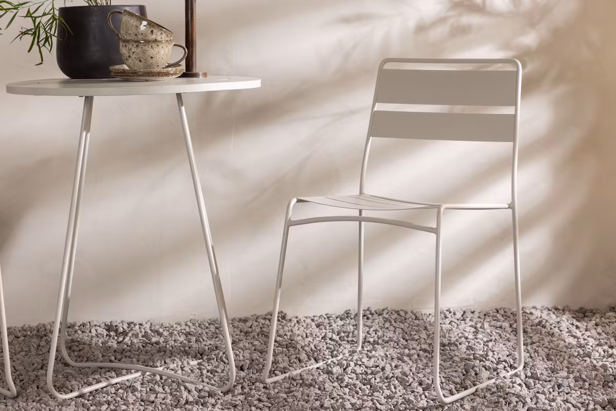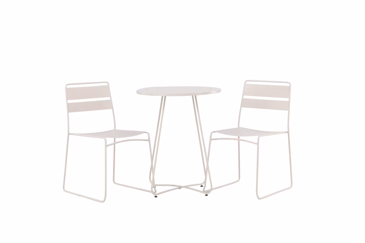 Stilren, smart och minimalistisk cafégrupp! Bordet Bacong har en nätt design och är tillverkat i beige stål som gör bordet lika praktiskt som tåligt. Här tillsammans med 2st matchande matstolar från serien Lina. Stolen har en smal utformning i beige stål som ger ett luftigt intryck. Perfekt till den lilla balkongen eller uteplatsen! Bordets diameter: 60cm.