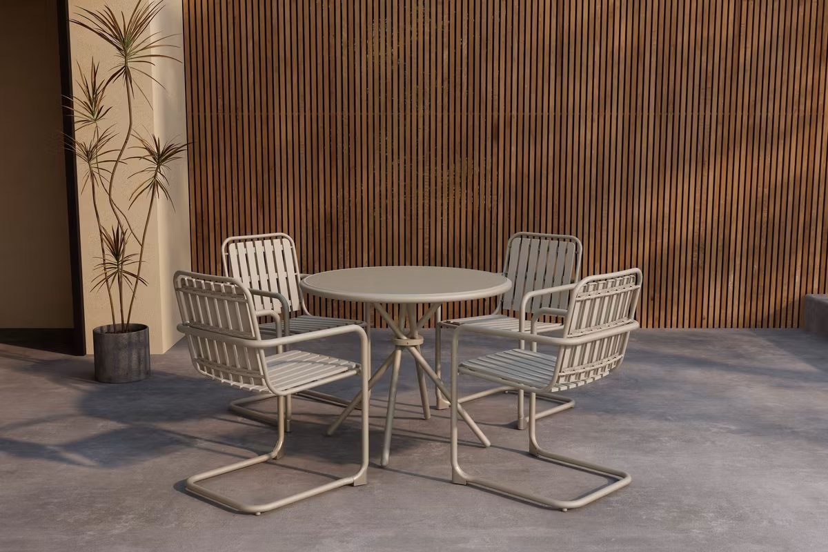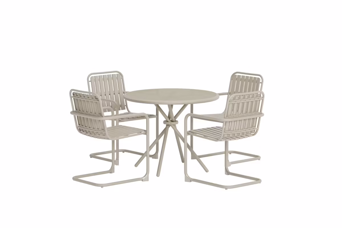 Chios är en elegant matgrupp som kombinerar tidlös form med praktisk komfort. Gruppen består av ett runt bord och fyra stolar i en stilren design som ger ett modernt och enhetligt uttryck. Den runda bordsformen skapar en naturlig samlingspunkt där alla kan mötas på samma villkor – perfekt för både vardagsmiddagar och festliga tillfällen. Med sitt ljusa och stilrena utseende blir Chios matgrupp en vacker och funktionell mittpunkt på din altan, balkong eller i trädgården.