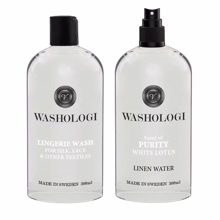 Washologis Lingerie kit 2 x 300 ml innehåller tvättmedel och linnevatten med en mild doft av vit lotusblomma. Lingerie wash: Tvättmedel för dina finaste underkläder, även för de i silke och spets. Produkterna är biologiskt nedbrytbara och fria från enzymer och färgämnen. Linen water: Linnevatten som ger kläderna en fräsch doft mellan tvättarna, ger en doft av vit lotusblomma.